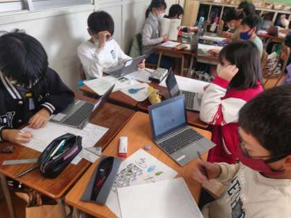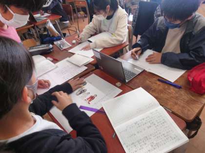 グループごとに「合気道」「茶道」「人形浄瑠璃」「獅子舞」「歌舞伎」「お茶」「包丁」「剣道」について、和の文化の「歴史」や「他との関わり」「支える人びと」「種類」「作り方」などの内容を1人1台PCで調べ、パンフレットにまとめています。