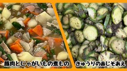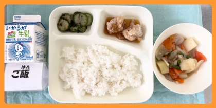 今日の献立は、あげどりのねぎだれかけ・豚肉とじゃがいもの煮もの・きゅうりの赤じそあえ・ごはん・牛乳でした。