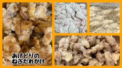 あげどりのねぎだれかけは、鶏肉に料理酒・しょうが汁で下味をつけ、でん粉をまぶして菜種油で揚げ、白ねぎ・砂糖・米酢・こいくちしょうゆ・ごま油を合わせたタレをからませています。