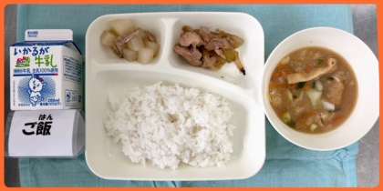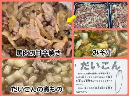 今日の献立は、鶏肉の甘辛焼き・みそ汁・だいこんの煮もの・ごはん・牛乳でした。