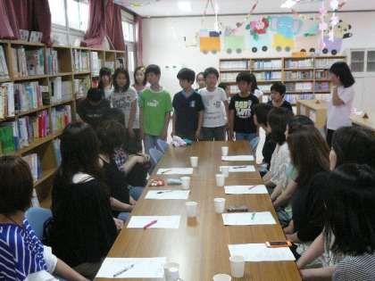 今日は、学校図書館ボランティア会議をひらいて打ち合わせを行い、児童図書委員との顔あわせを行いました。子どもたちと向かい合って、自己紹介をしました。少し緊張していました。