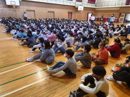 今日の児童朝会は、全学年がそろって講堂で行いました。