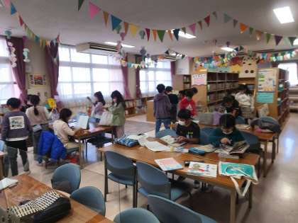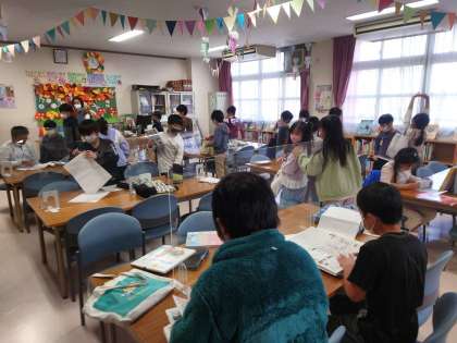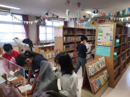 子どもたちが自分の興味や関心のある本を探して読んでいます。