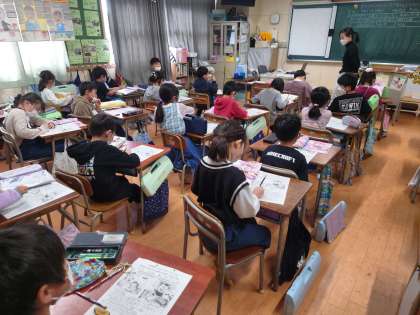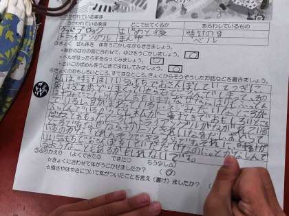 音楽科の時間は、アンダソン作曲の「ゆかいな時計」を聴いて、おもしろいところ、すてきなところ、曲から想像したお話など、考えたことや感じたことをワークシートにまとめました。
