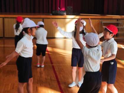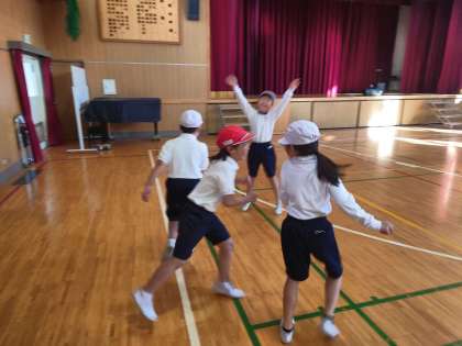 音楽を聴いて、ぴったり合った動きをグループで考えました。