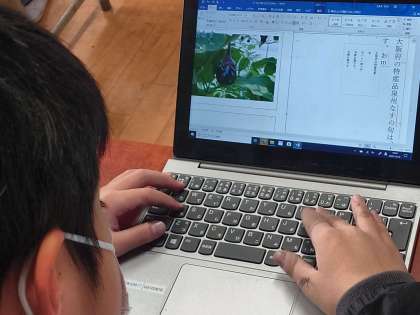「水なす」「きゅうり」「みかん」など、大阪にあるいろいろな特産品を調べ、パソコンを使ってまとめています。