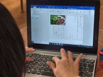 国語科の時間は、自分たちの住む地域のおすすめの料理や特産品を調べてリーフレットを作る活動をしています。