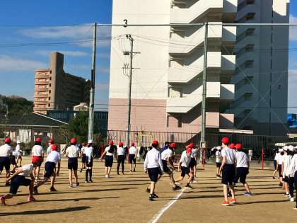 準備体操の後、走るために筋肉をほぐす運動を行いました。