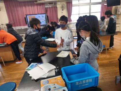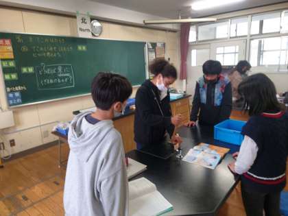 理科の時間は、くぎを抜くとき、くぎぬきをどのように使えば楽にくぎを抜くことができるのか、実際に試しながら考えています。