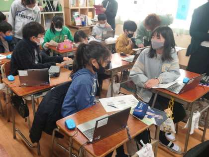子どもたちが、どのようなプログラムを組むとうまく図形を描くことができるか、話し合っています。