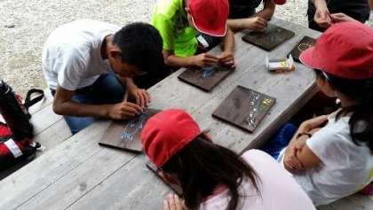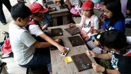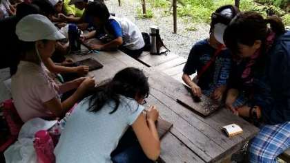 魚つかみのあとに、魚が焼き上がるまでの間に、焼き板の絵付けを行いました。