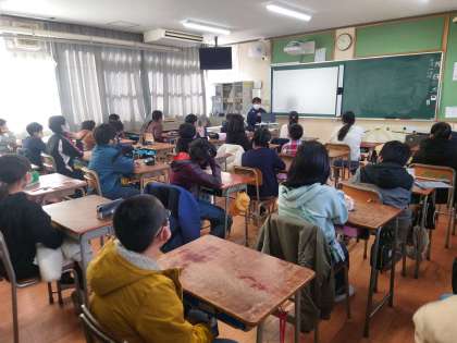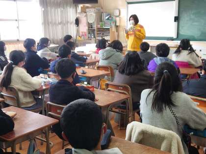 避難訓練の前に、各学級で地震や津波が起こったときの避難の方法などについて子どもたちに話をしました。