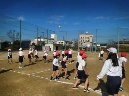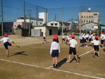 体育科の時間は、運動場でドッジボールをしました。