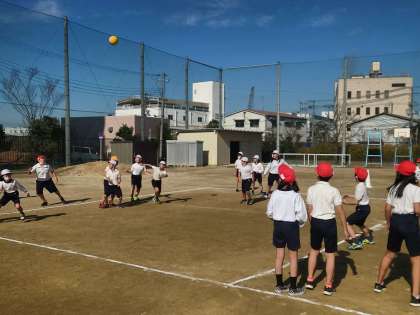 2チームに分かれ、ボールを元気に楽しく投げ合いました。