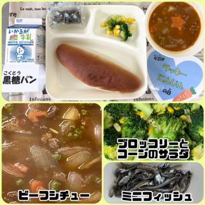 今日の献立は、ビーフシチュー・ブロッコリーとコーンのサラダ・ミニフィッシュ・黒糖パン・牛乳でした。