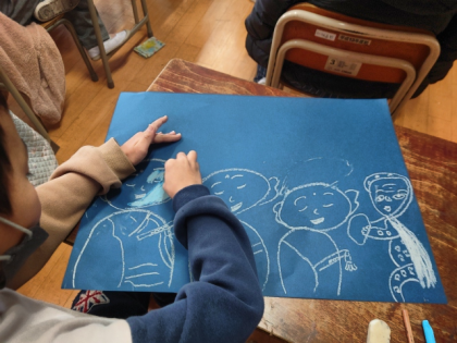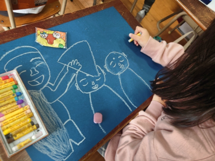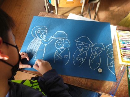国語科の物語文「かさこじぞう」のお話をもとに、画用紙いっぱいにパスで絵を描いています。