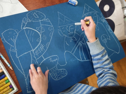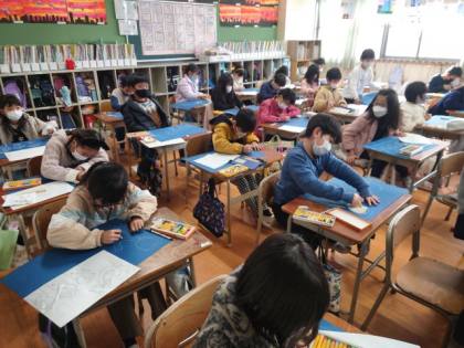 国語科の物語文「かさこじぞう」のお話をもとに、画用紙いっぱいにパスで絵を描いています。