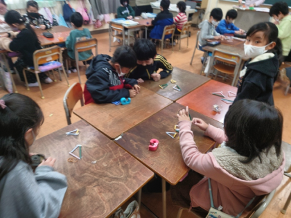 今日は、長さが違うストローを3本ずつ使って、いろいろな形の三角形を作りました。