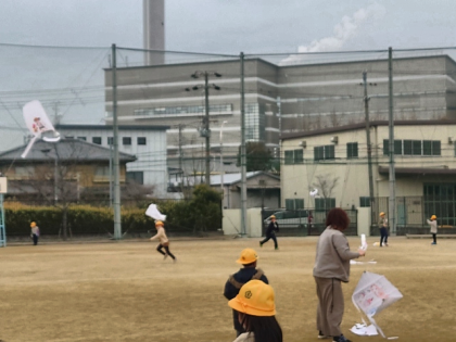 生活科の時間は、運動場で「ぐにゃぐにゃだこ」を飛ばしました。