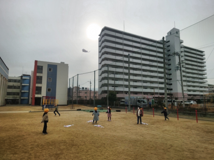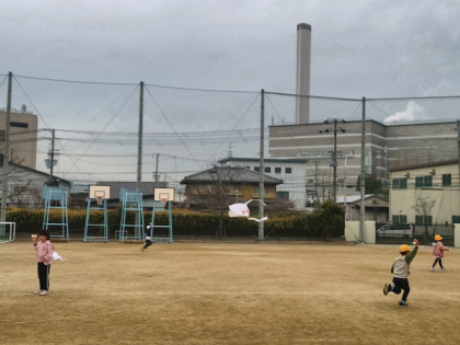 生活科の時間は、運動場で「ぐにゃぐにゃだこ」を飛ばしました。