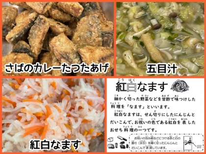 今日の献立は、さばのカレーたつたあげ・五目汁・紅白なます・ごはん・牛乳でした。