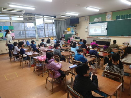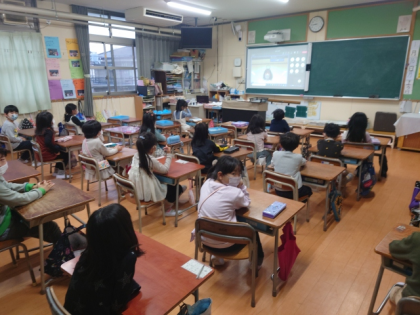 大阪モデルが「レッドステージ」となったため、全校児童が講堂で集合することを休止し、各教室と多目的室をオンラインで結んで児童朝会を行いました。