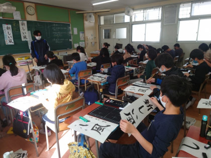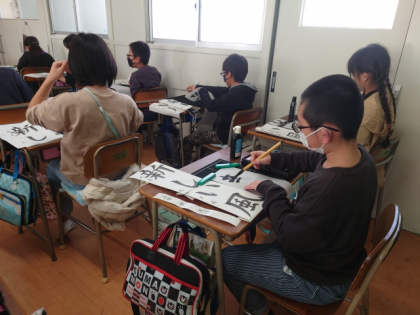 バランスがとりづらい字ですが、字画の大きさや位置に気を付けて、書初めの長い半紙に丁寧に書いていました。