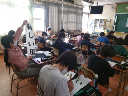 書写の時間は、毛筆で「新しい風」の字を練習しました。