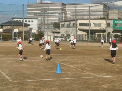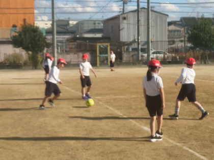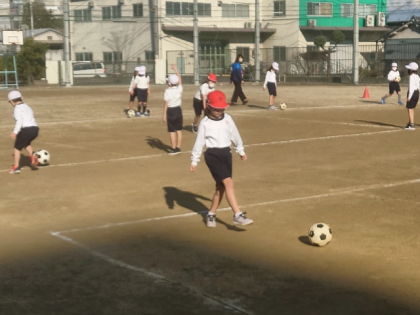 体育科の時間は、運動場で「ボールけり遊び」の学習をしています。