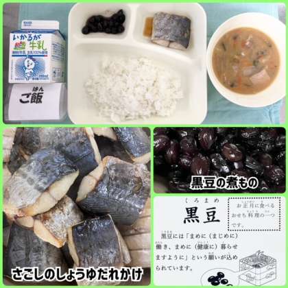 今日の献立は、さごしのしょうゆだれかけ・みそ汁・黒豆の煮もの・ごはん・牛乳でした。
