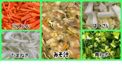 みそ汁は、豚肉・はくさい・たまねぎ・にんじん・青ねぎを使用しています。