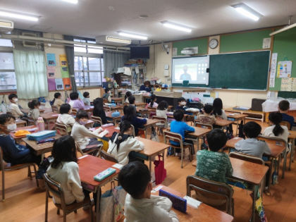 大阪モデルが「レッドステージ」となったため、全校児童が講堂で集合することを休止し、各教室と多目的室をオンラインで結んで児童朝会を行いました。