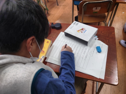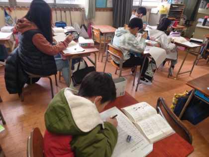 国語科の時間は、教科書の教材文「数え方を生み出そう」の本文の「おそらく」「とらえる」「特ちょう」「とはいえ」などの言葉の意味調べをしています。