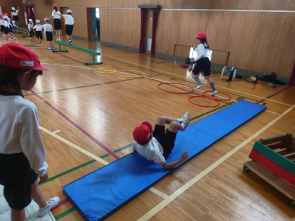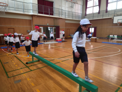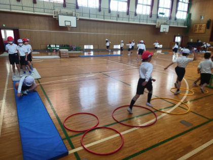 体育科の時間は、体育館で平均台、マット、跳び箱、フープなどを使って基礎体力を養うためにサーキットトレーニングを行いました。