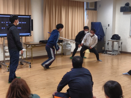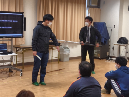 今日は、さすまたの使用方法と不審者が教室内に入ってきたときの対処方法などについて教わりました。