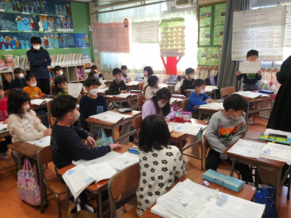 国語科の時間は、教科書の教材文「かさこじぞう」の学習をしています。