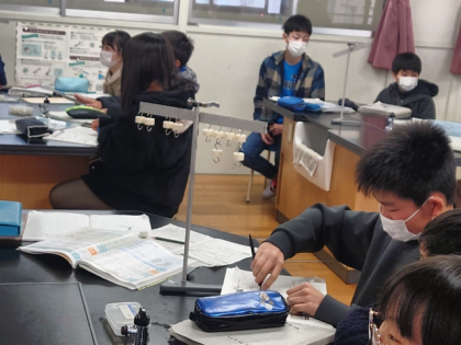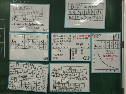 理科の時間は、てこを使ったてんびんの働きについて学習しています。