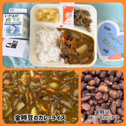 今日のカレーライスは、牛肉を主材にじゃがいも・たまねぎ・にんじん・ドライパックの金時豆を使用しています。