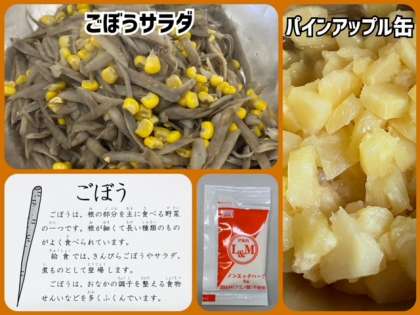 サラダは、ごぼうとコーンを塩・米酢・うすくちしょうゆで煮て下味をつけ、喫食時に小袋の『ノンエッグドレッシング』をかけていただきます。