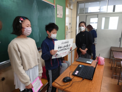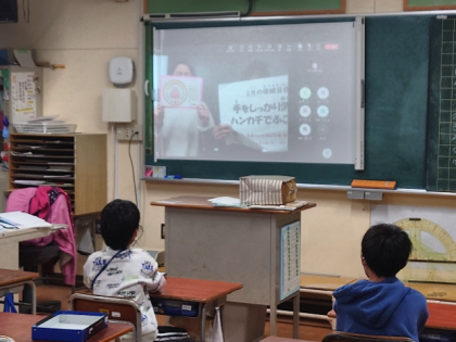 2月2日(木)〜8日(水)の間、「手あらいピカピカ週間」として、外遊びから帰った時などに手洗いができたか、きれいなハンカチやティッシュを持って来たかの項目にできたら〇をつけるカードを配り、やってもらうことになったこと、また、学校保健委員会は今年度も密を避けるため、壁新聞を作ることでその代わりとし、保健室前の廊下に貼ったことをチームズを通して発表しました。
