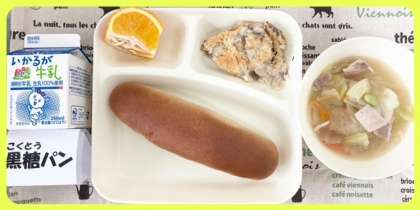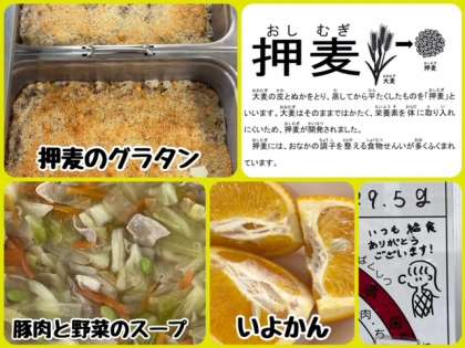 今日の献立は、押麦のグラタン・豚肉と野菜のスープ・いよかん・黒糖パン・牛乳でした。