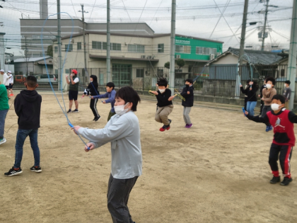 子どもたちがなわとびのいろいろな技に挑戦しています。