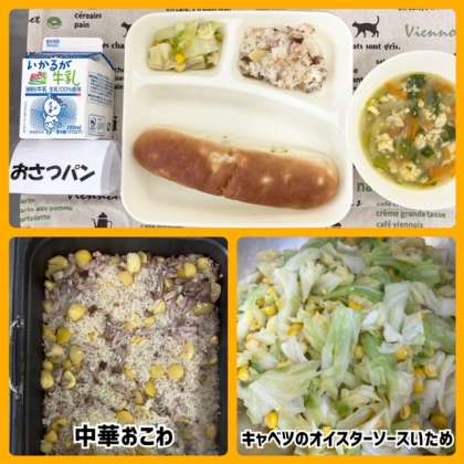 今日の献立は、中華おこわ・卵スープ・キャベツのオイスターソースいため・おさつパン・牛乳でした。