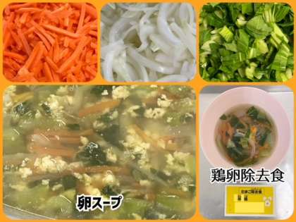 卵スープは、鶏肉・にんじん・たまねぎ・チンゲンサイを煮、液卵を流し入れます。この献立は、鶏卵(液卵)の除去食対応献立です。除去食は、誤配・誤食防止のため、個票をつけてピンク色の食器に配食しています。