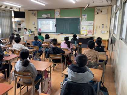 今週は、各教室と多目的室をオンラインで結んで児童朝会を行いました。