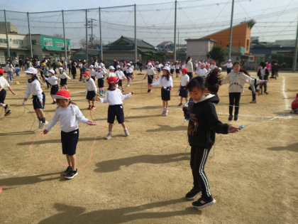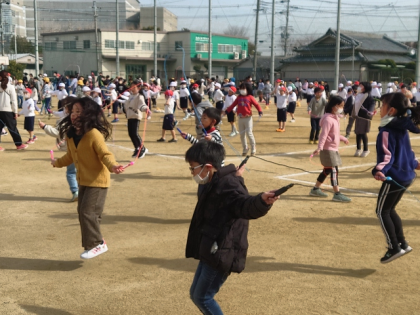 全校児童が20分休みに運動場に集まり、なわとびをしています。