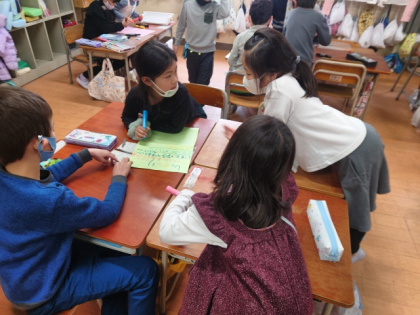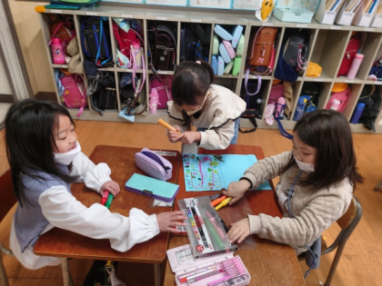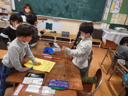 図画工作科の時間は、紙はんがで「おにの かお」をつくります。