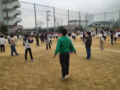 今日も、全校が運動場に集まって、元気になわとびをしています。