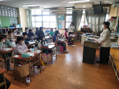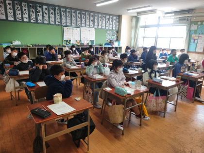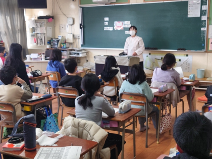 歯科衛生士の方に来ていただき、4年生の教室で、歯を強くするためのフッ化物洗口を行いました。