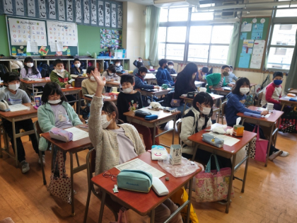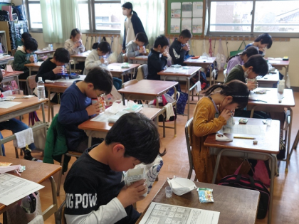 歯科衛生士の方に来ていただき、4年生の教室で、歯を強くするためのフッ化物洗口を行いました。